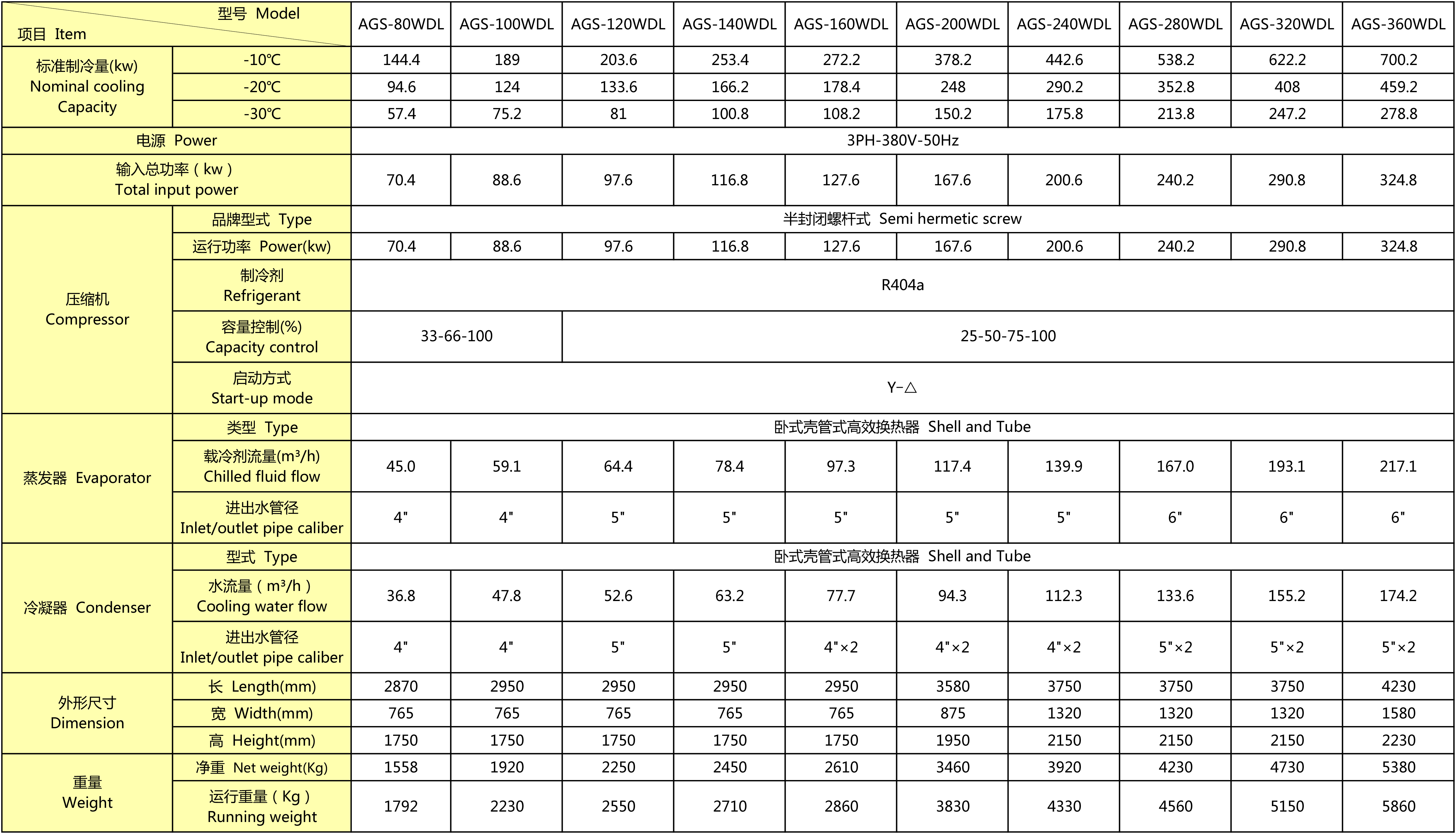 1、制冷量是在以下温度条件下测得:冷冻液为60%乙二醇水溶液;冷却水入/出口温度为32℃/37℃。