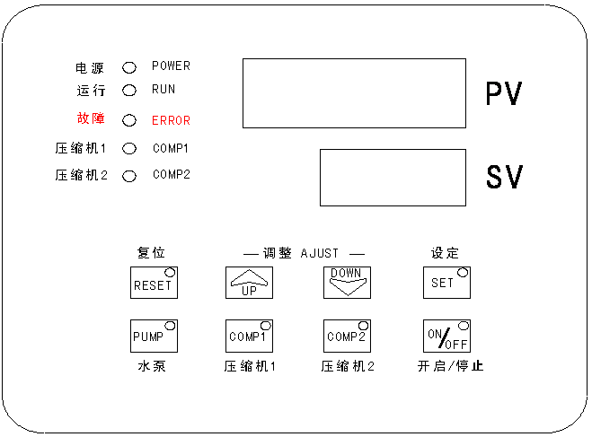3、关机:按“STOP” 停止键关闭机器。如长时间不使用时,请关闭冷冻机电源并排掉水箱内或壳管式蒸发器内的冷冻介质。